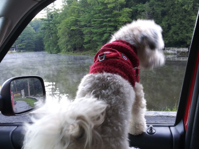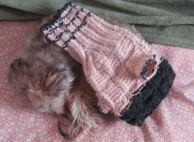 My second attempt at trying to follow a pattern with a picture. This sweater is more relaxed as I let out the measurements to make it easier to remove from my dog.